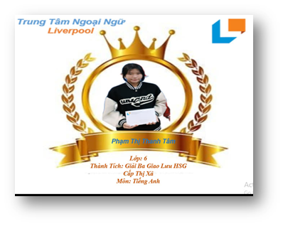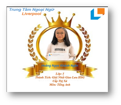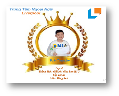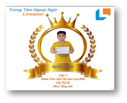 Góc vinh danh học sinh tại Trung tâm Ngoại ngữ Liverpool là nơi ghi nhận và tôn vinh những thành tích xuất sắc của các bạn học viên. Tại đây, chúng tôi tự hào giới thiệu những học sinh đạt điểm cao trong các kỳ thi Cambridge quốc tế, những bạn có thành tích vượt trội trong học tập tại trung tâm, cũng như các học viên đạt giải cao trong các cuộc thi học sinh giỏi cấp trường, thị xã, và cấp tỉnh. Đây không chỉ là sự công nhận cho nỗ lực của các bạn, mà còn là nguồn cảm hứng để tất cả học viên cùng phấn đấu và vươn xa hơn trong hành trình học tập của mình.