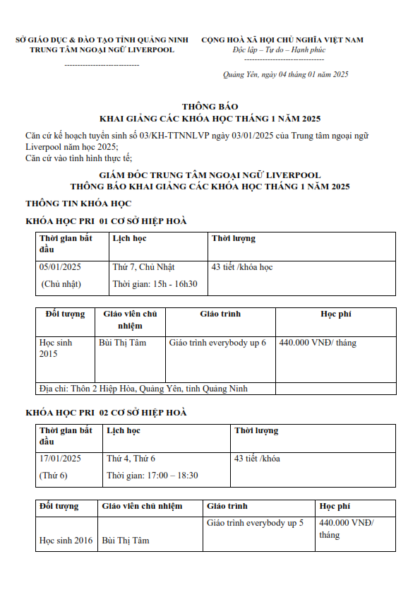 THÔNG BÁO KHAI GIẢNG THÁNG 1 NĂM 2025